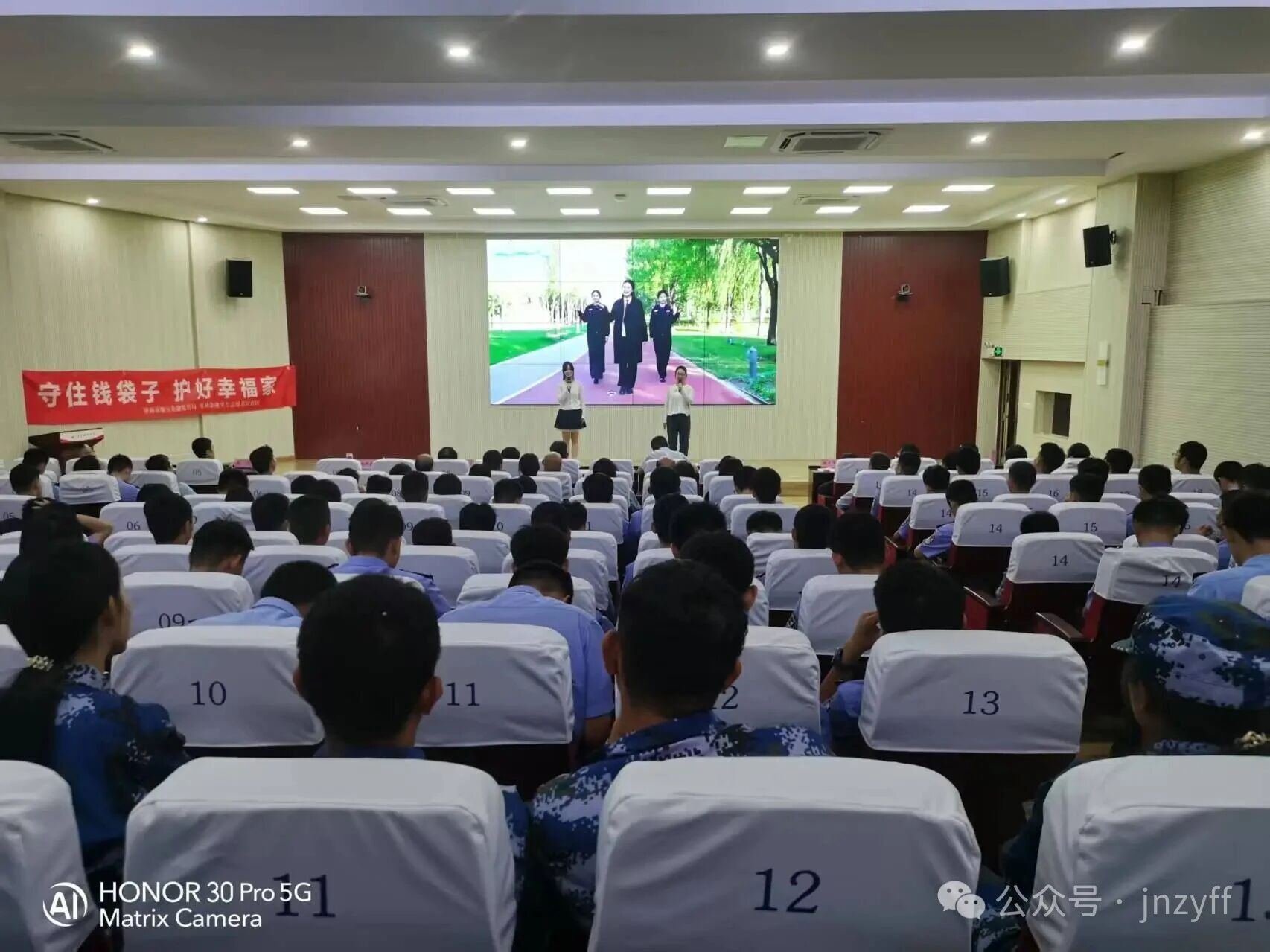 随后,“反诈奶奶们” 轮番登场,献上了精心准备的反诈节目。她们用通俗易懂、生动有趣的表演形式,将防非反诈知识融入其中,让学子们在轻松愉快的氛围中学习和掌握识别诈骗、防范诈骗的技巧。同时,“反诈奶奶们” 还向学校赠送了寓意着 “筑牢防诈防线” 的书法作品,传递出共同守护校园安全的美好愿景。